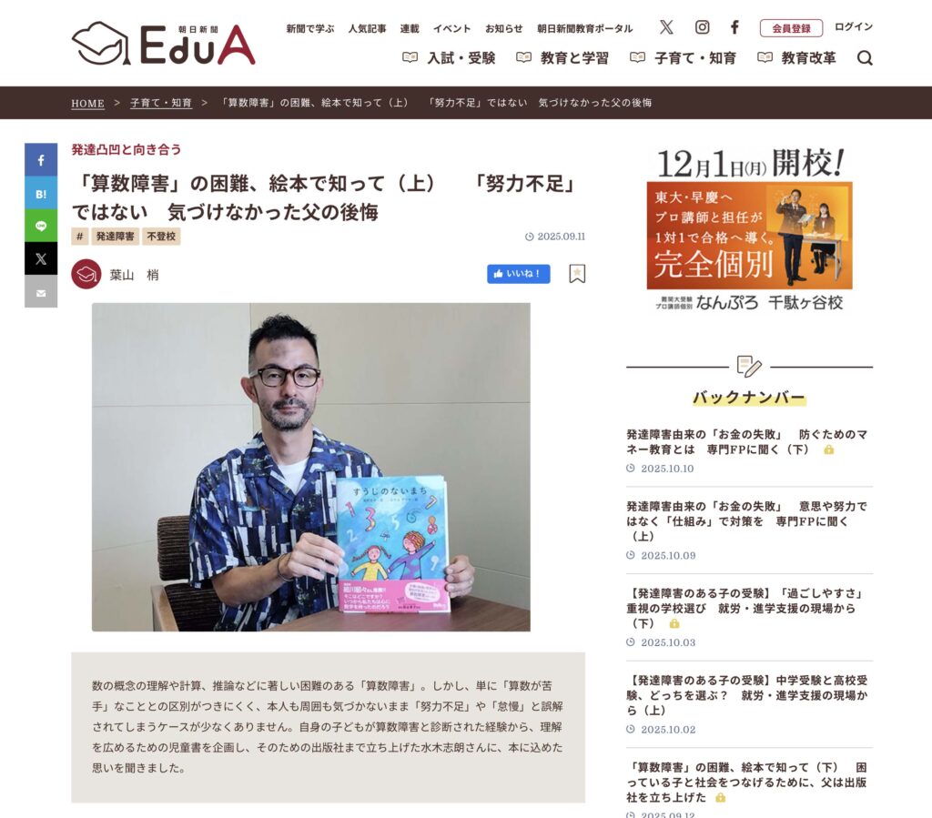子育て学びのメディア、朝日新聞EduAさんで取材していただきました。編集長の葉山さんには丁寧に話を聞いていただき記事にしてもらい感謝です!『すうじのないまち』完成にあたり、算数障害の困り事や、わからなさ、気づきにくさなどについてお話ししました。 読んでもらえたら嬉しいです。